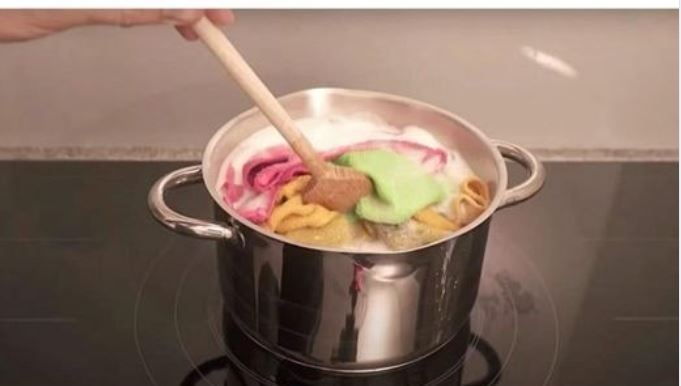Uronite krpe i pustite da lagano vrije 15 minuta. Toplina i hemijska reakcija ovih prirodnih sastojaka uklanjaju bakterije, masnoću i neugodne mirise. Nakon hlađenja, dobro ih isperite čistom vodom i osušite.