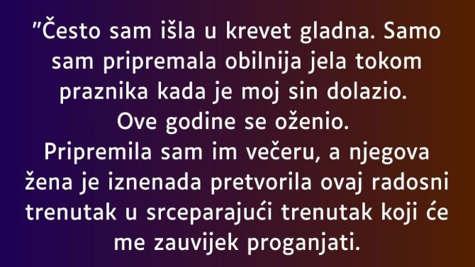 Možda najteži deo cele priče nije bio komentar snahe, već ćutanje sina. Za majku, sin nije samo dete, već i osoba kojoj je posvetila život, kojoj je kroz godine prenosila ljubav upravo kroz kuhinju i obroke.