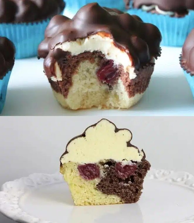 Die Hälfte des Teigs in die Muffin-Förmchen verteilen, den Rest mit 2 EL Milch und dem Kakao verrühren und über den hellen Teig in die Muffin-Förmchen geben.