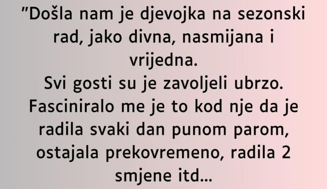 Djevojka je od prvog dana radila sa osmijehom i pozitivnom energijom, koja je odmah osvježila cijeli tim. Kolege su je opisivali kao vedru, nasmijanu i izuzetno predanu, dok je vlasnik ostajao zatečen njenim radnim etosom.