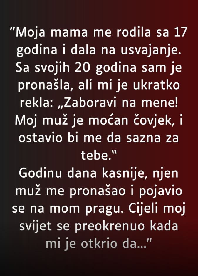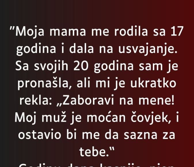 Kada sam napunila 20 godina, želja da otkrijem više o svojim korenima postala je gotovo neodoljiva. Osećaj da pripadam nekoj priči, da postoji deo mene koji je izvan mog života, postajao je sve snažniji. Posle višemesečne uporne potrage, konačno sam uspela da lociram svoju biološku majku. Međutim, odgovor koji sam dobila bio je hladan, kratak i bolan: „Zaboravi me!“
